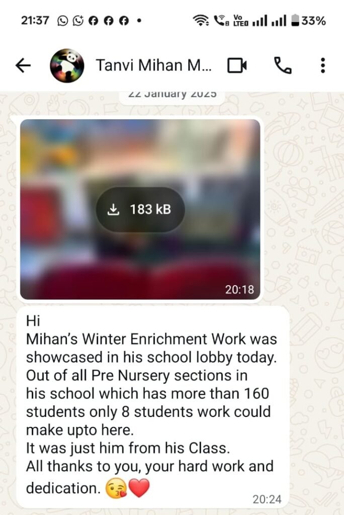 In my classes, students learn watercolor, acrylic, oil pastel, and pencil art. I also create wall art for restaurants and homes, including Desian Restaurant, Faridabad and The Innovation Cake Bakery, Delhi NCR. I have taught students across India and internationally, including Abu Dhabi, UAE, through online classes, and have organized over 200 workshops and bootcamps.